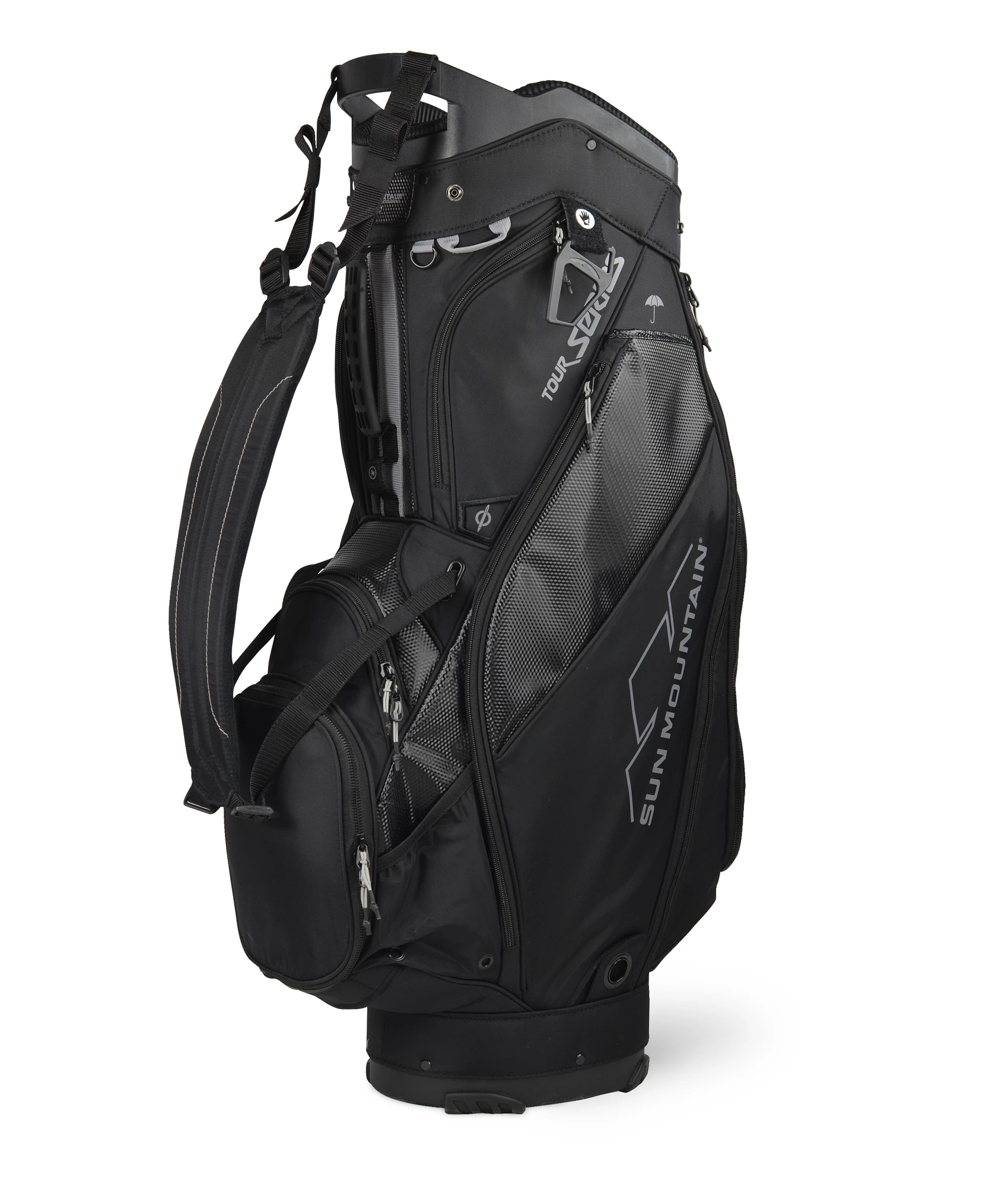 A full-sized, full-featured cart bag, the Tour Series is designed for riding and push cart use. Tour Series has more traditional cart bag styling, is constructed with a combination of nylon and vinyl fabrics, and has ten pockets available to organize your gear. Its spacious, four-way top with full-length dividers makes pulling clubs easy.